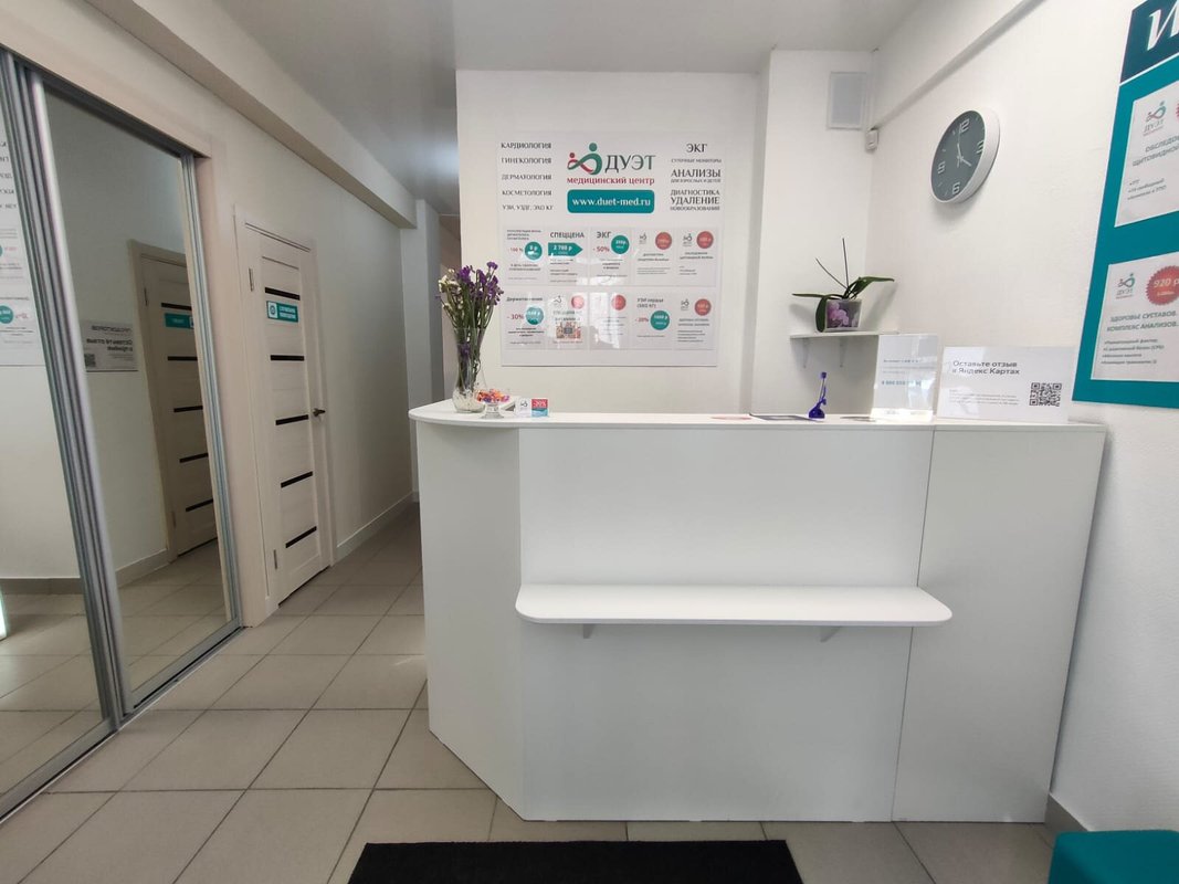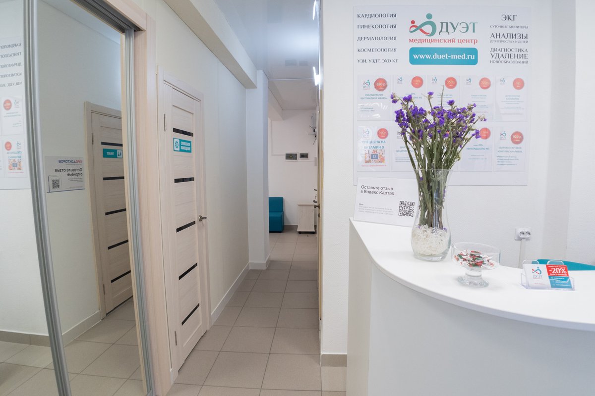 Медицинский центр Дуэт - это многопрофильное медицинское учреждение, предлагающее индивидуальный комплекс процедур для каждого клиента. Работа клиники организована с учетом комфортного пребывания посетителей. Новейшее оборудование центра помогает провести диагностические исследования организма пациента для составления программы лечения и профилактических мероприятий. В клинике функционируют отделения общей терапии, кардиологии, гастроэнтерологии, дерматологии, гинекологии, акушерства, маммологии. Наши врачи имеют профильное медицинское образование и с пониманием отнесутся к вашим проблемам. Доверяя свое лечение нам, вы можете быть уверены в результате. Также мы поможем с подбором диеты и коррекцией веса.